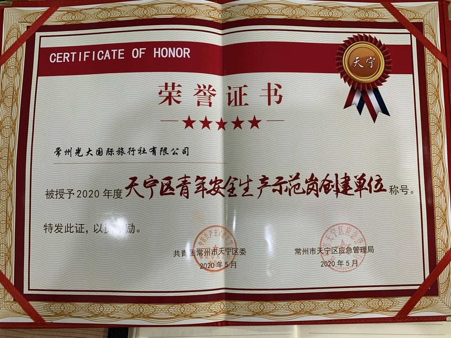 喜讯!光大国旅荣获“天宁区青年安全生产示范岗创建单位”表彰